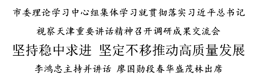 17日,市委理论学习中心组以贯彻落实习近平总书记视察天津重要讲话精神调研成果交流会形式组织集体学习。会议聚焦学懂弄通做实习近平新时代中国特色社会主义思想,紧紧围绕2019年习近平总书记视察天津三年来我市学习贯彻落实的举措成效,就进一步贯彻落实习近平总书记对天津工作“三个着力”重要要求和一系列重要指示批示精神,全面落实中央经济工作会议部署,加快推动高质量发展进行研讨交流。