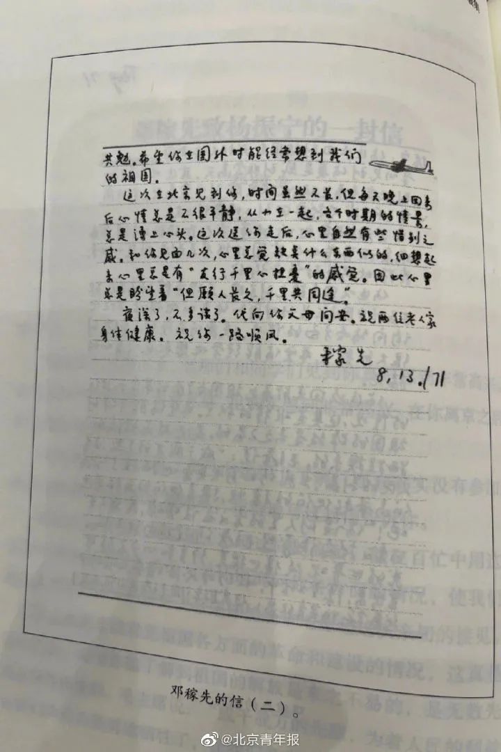 在信的末尾,邓稼先写道:但愿人长久,千里共同途。当时,杨振宁没看懂这句话。50年后杨振宁回应邓稼先的信时说:“我觉得今天五十年以后,我可以跟邓稼先说:稼先,我懂你‘共同途’的意思,我可以很自信地跟你说,我这以后五十年是符合你‘共同途’的瞩望,我相信你也会满意的。”