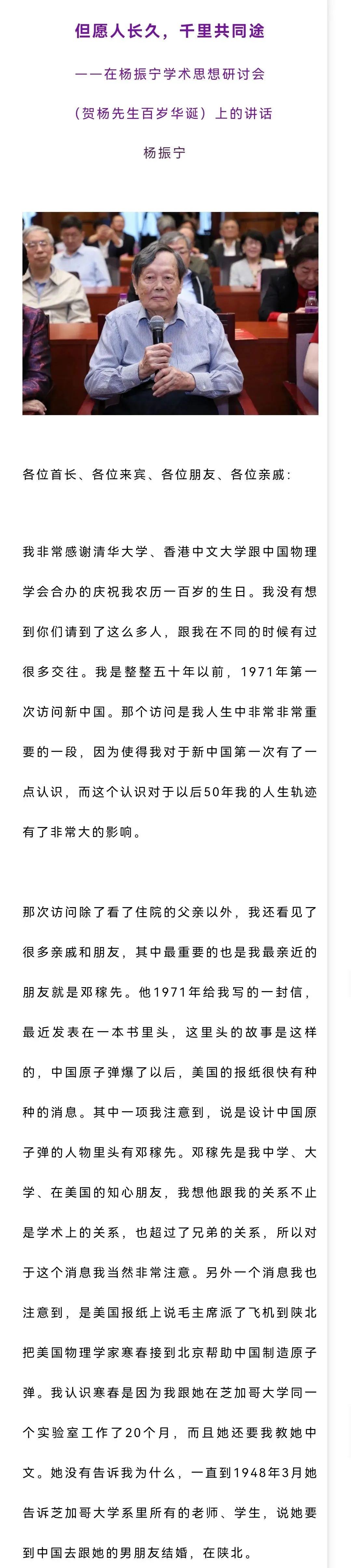 为庆祝杨振宁先生百岁诞辰,9月22日下午,由清华大学、中国物理学会、香港中文大学联合主办的杨振宁先生学术思想研讨会——贺杨先生百岁华诞在清华大学举行。会上,杨振宁先生以“但愿人长久,千里共同途”为题发表了讲话。