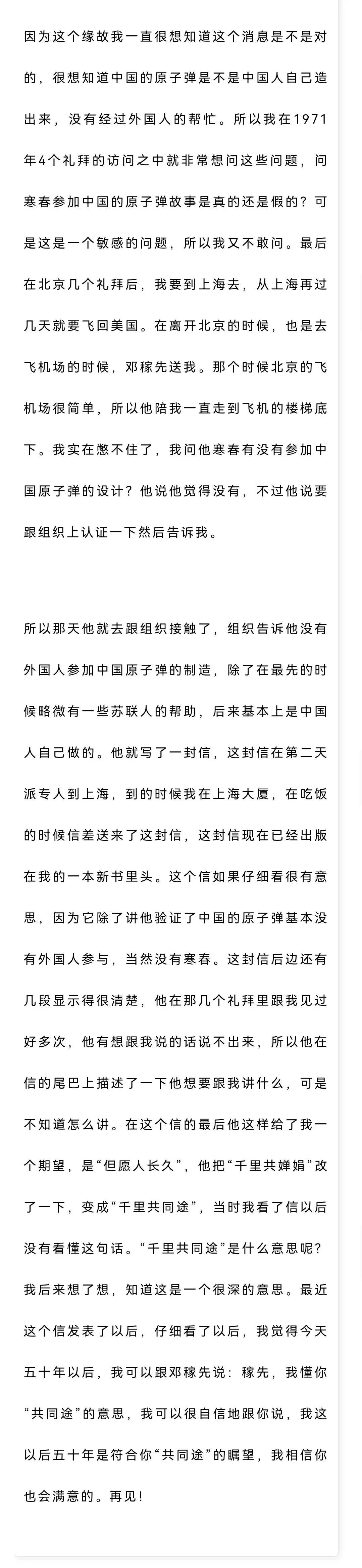 关于你要打听的事,我已向组织上了解,寒春确实没有参加过我国任何有关制造核武器的事,我特地写这封信告诉你。