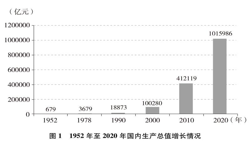 经济实力大幅提升。中国国内生产总值从1952年的679.1亿元跃升至2020年的101.6万亿元,经济总量占全球经济比重超过17%,稳居世界第二大经济体(图1)。人均国内生产总值从1952年的几十美元增至2020年的超过1万美元,实现从低收入国家到中等偏上收入国家的历史性跨越(图2)。制造业增加值多年位居世界首位,220多种工业产品产量居世界第一,自2010年起连续11年位居世界第一制造业大国。中国已是全球货物贸易第一大国、服务贸易第二大国、商品消费第二大国、外汇储备第一大国,2020年利用外资居全球第一。不断迈向共同富裕的14亿多人口,其中有超过4亿并不断扩大的中等收入群体,是全球最具成长性的超大规模市场,中国经济充满活力,具有巨大潜力和充足后劲。2020年,中国率先控制新冠肺炎疫情,率先复工复产,率先实现经济增长由负转正,充分彰显中国经济的强劲韧性。
