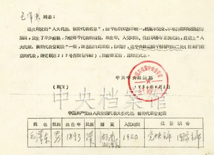 毛泽东填写的《中国共产党第八次全国代表大会代表、候补代表登记表》。