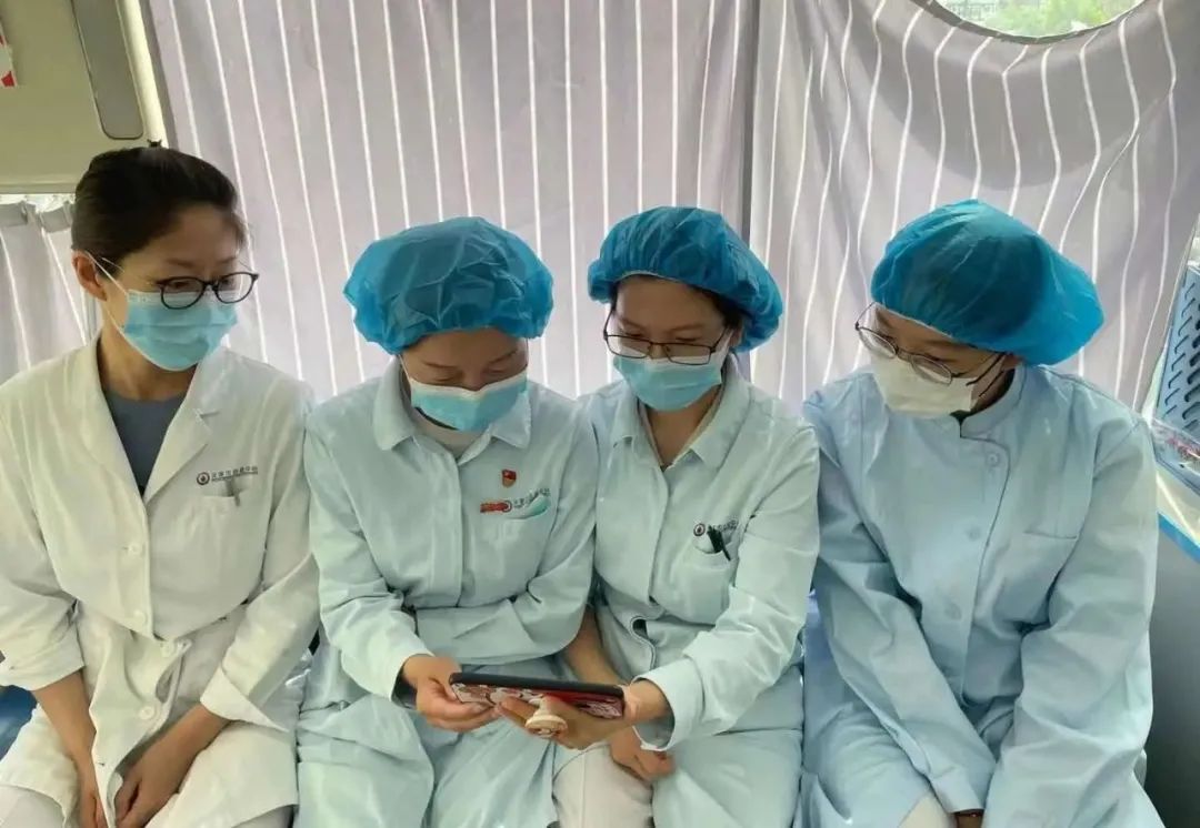 市血液中心集体收看庆祝中国共产党成立100周年大会电视直播,街头采血工作人员在献血车上观看直播。