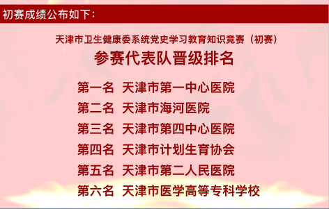 经过紧张角逐,共6支代表队进入天津市卫生健康委系统党史学习教育知识竞赛决赛。按得分依次为:天津市第一中心医院、天津市海河医院、天津市第四中心医院、天津市计划生育协会、天津市第二人民医院、天津市医学高等专科学校。