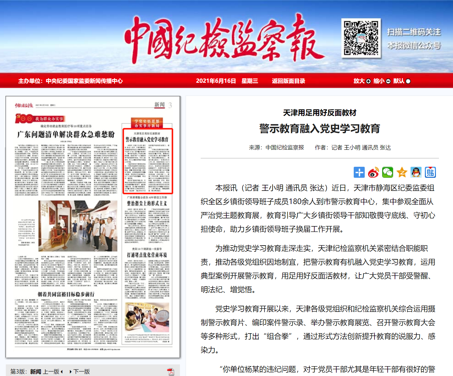 为推动党史学习教育走深走实,天津纪检监察机关紧密结合职能职责,推动各级党组织因地制宜,把警示教育有机融入党史学习教育,运用典型案例开展警示教育,用足用好反面活教材,让广大党员干部受警醒、明法纪、增觉悟。