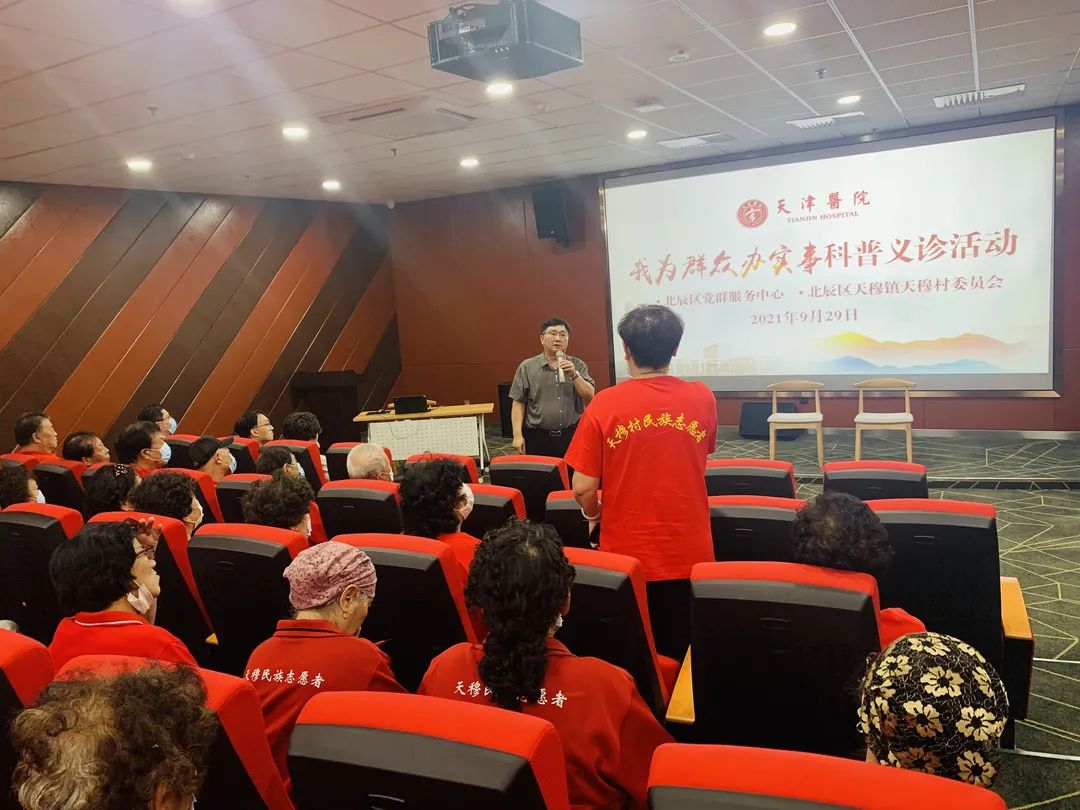当天,天津医院放疗科的张春智主任医师、创伤髋关节二病区的董强主任医师、创伤肢体矫正与重建二病区的舒衡生主任医师,从位于河西区的医院出发,为来自天穆镇天穆村的80位中老年群众开展《恶性肿瘤的防与治》《内、外固定矫正下肢畸形》《老年髋部骨折的治疗及预防》三场科普讲座和义诊活动。讲座现场,专家们用深入浅出的语言,配合视频、图片进行讲解,场下群众听得聚精会神、频频点头。义诊时段,面对大家的踊跃提问,三位主任耐心给予解答。