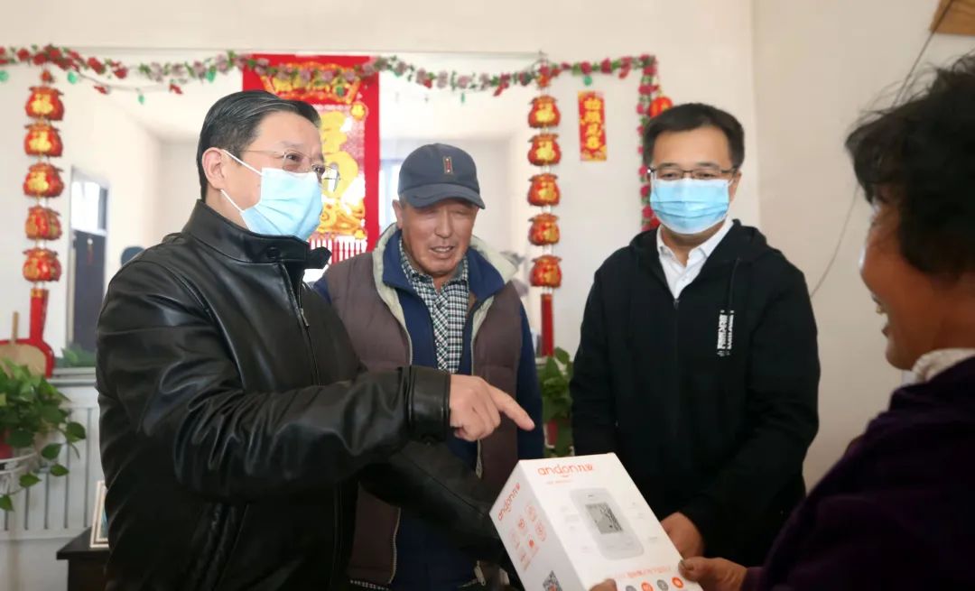 10月21日上午,天津市卫生健康委二级巡视员何鹏带领医学专家和相关工作人员来到一位长期患病的村民家中,为村民送上血压仪、家庭药箱以及健康宣传品。