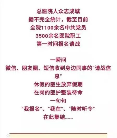 “有任务绝对不推辞,主动要求上前线。”当动员令发布之后,总医院人众志成城,据不完全统计,全院1100余名共产党员、3500余名医院职工报名请战,