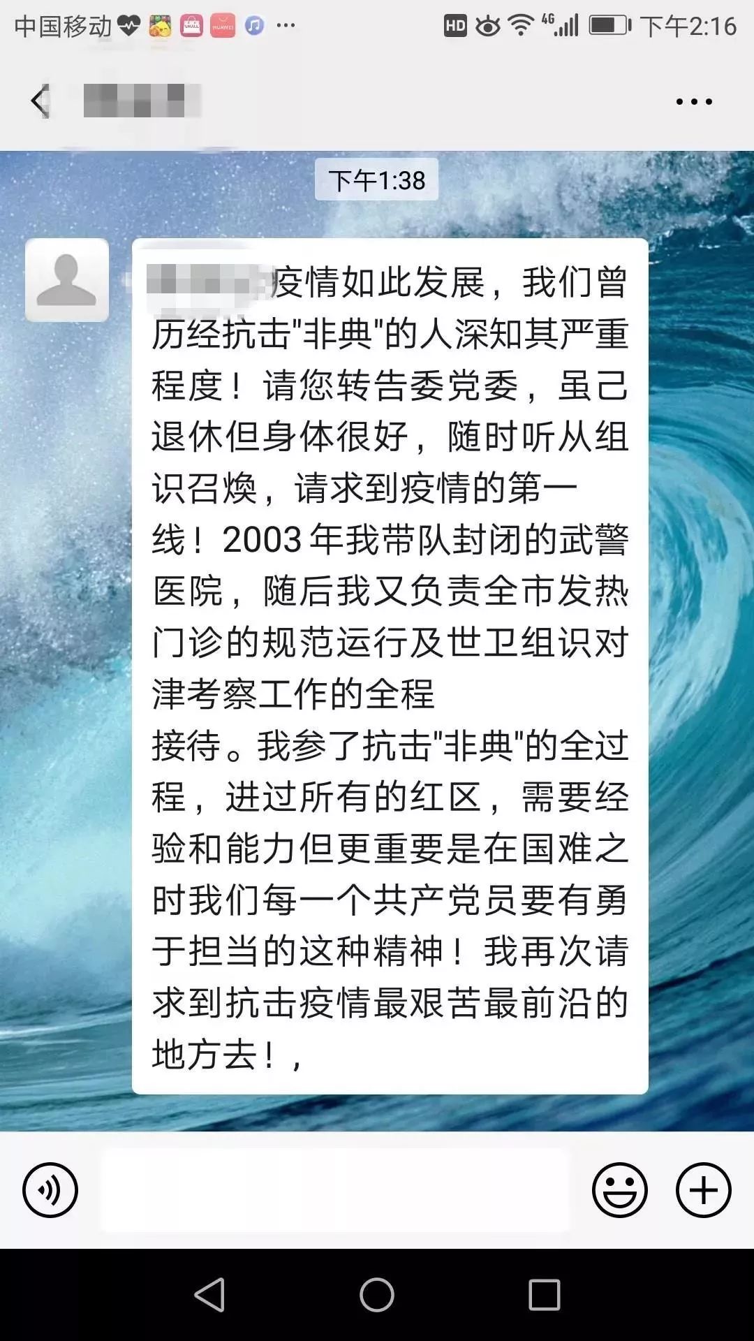 原市卫生计生委人事处处长李双印再三请战:“愿为天津市疫情防控工作贡献力量!我亲身经历过‘非典’,不会给领导添麻烦!”