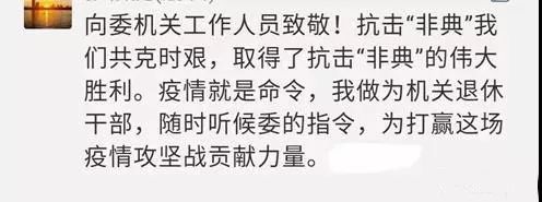 发出请战书的离退休老干部、老党员、老劳模、老专家还有很多,如:乔懋彬、张愈、申长虹、贾家琦、韩立、石岩、黄金虎、孙秀梅、张景砚、耿学兰等,他们先后向委党委诚挚表态,志愿参与和支持疫情防控工作,随时待命、听从召唤。