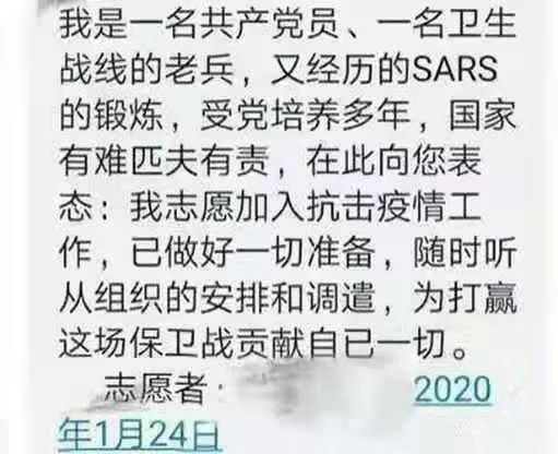 原市卫生局医政处处长、全国劳动模范华勇在农历年三十递交的请战书中写道:“我是一名共产党员、一名卫生战线的老兵,又经历了抗击SARS的锻炼。受党培养多年,国家有难匹夫有责,我志愿加入抗击疫情工作,为打赢这场保卫战贡献自己的一切。”