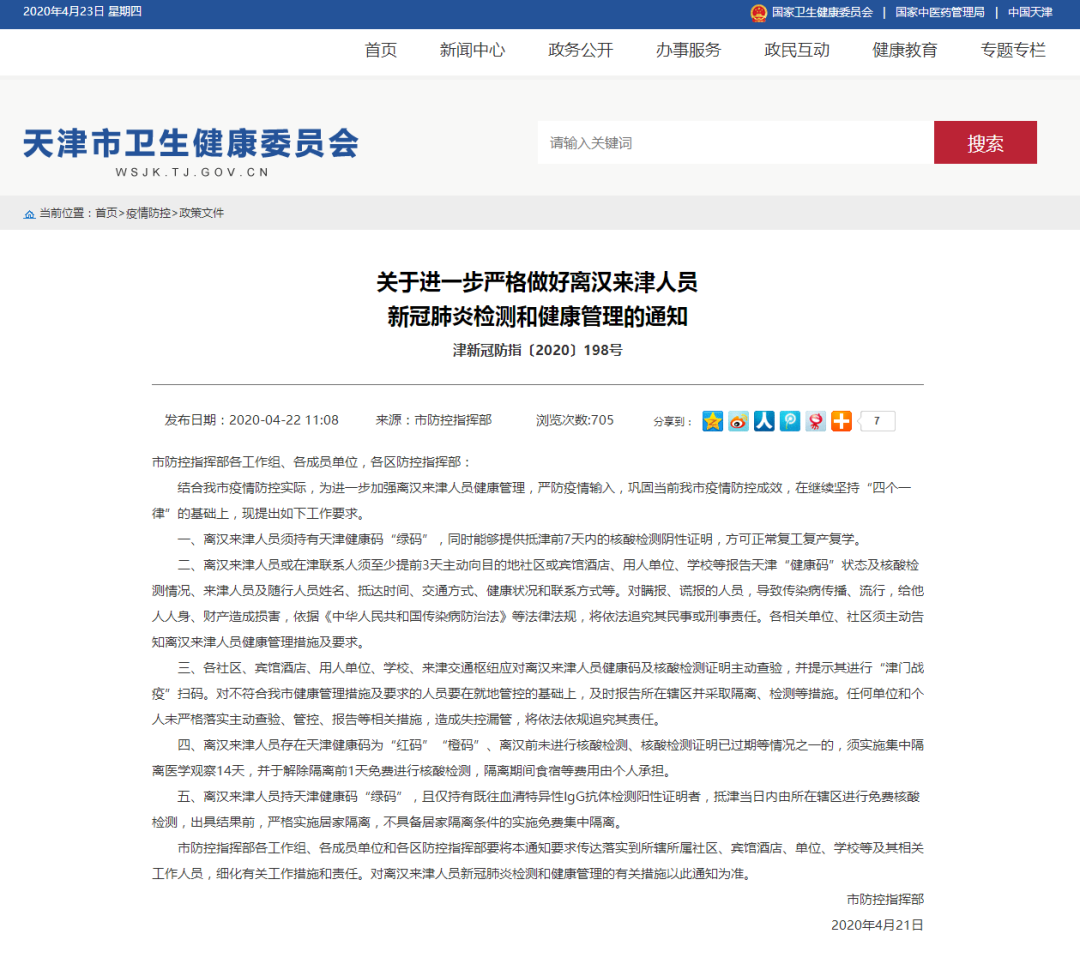 结合我市疫情防控实际,为进一步加强离汉来津人员健康管理,严防疫情输入,巩固当前我市疫情防控成效,在继续坚持“四个一律”的基础上,现提出如下工作要求。