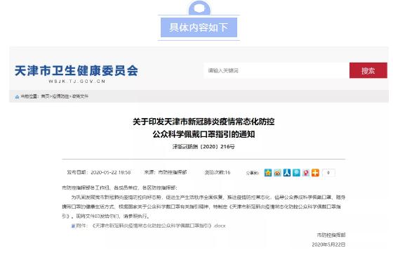 5月22日,从天津市新冠肺炎疫情防控指挥部获悉,为巩固发展我市新冠肺炎疫情防控向好态势,促进生产生活秩序全面恢复,推进疫情防控常态化,倡导公众养成科学佩戴口罩、随身携带口罩的健康生活方式,根据国家关于公众科学戴口罩有关指引精神,特制定《天津市新冠肺炎疫情常态化防控公众科学佩戴口罩指引》。