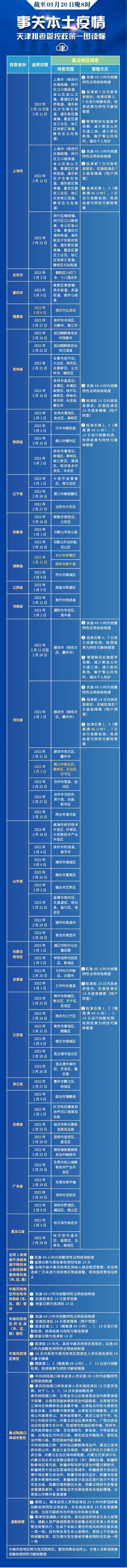 相关人员主动报备。新增具有2022年3月4日(含)以来途经福建省莆田市仙游县,具有2022年3月13日(含)以来途经湖南省长沙市芙蓉区,具有2022年3月13日(含)以来途经湖南省邵阳市新宁县,具有2022年3月5日(含)以来途经河北省唐山市路北区、高新区、古冶区、开平区旅居史的来津及返津人员,需持48小时内核酸阴性证明或出示包含核酸检测阴性信息的健康码“绿码”,主动向社区、工作单位等报备,抵津前14日内具有旅居史,实施抵津后14天居家隔离(同户同室)。