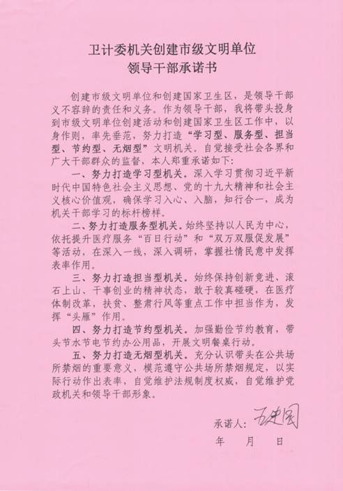 委领导班子全体成员签订《卫计委机关创建市级文明单位领导干部承诺书》,承诺在机关带头践行“五型文明机关”活动标准