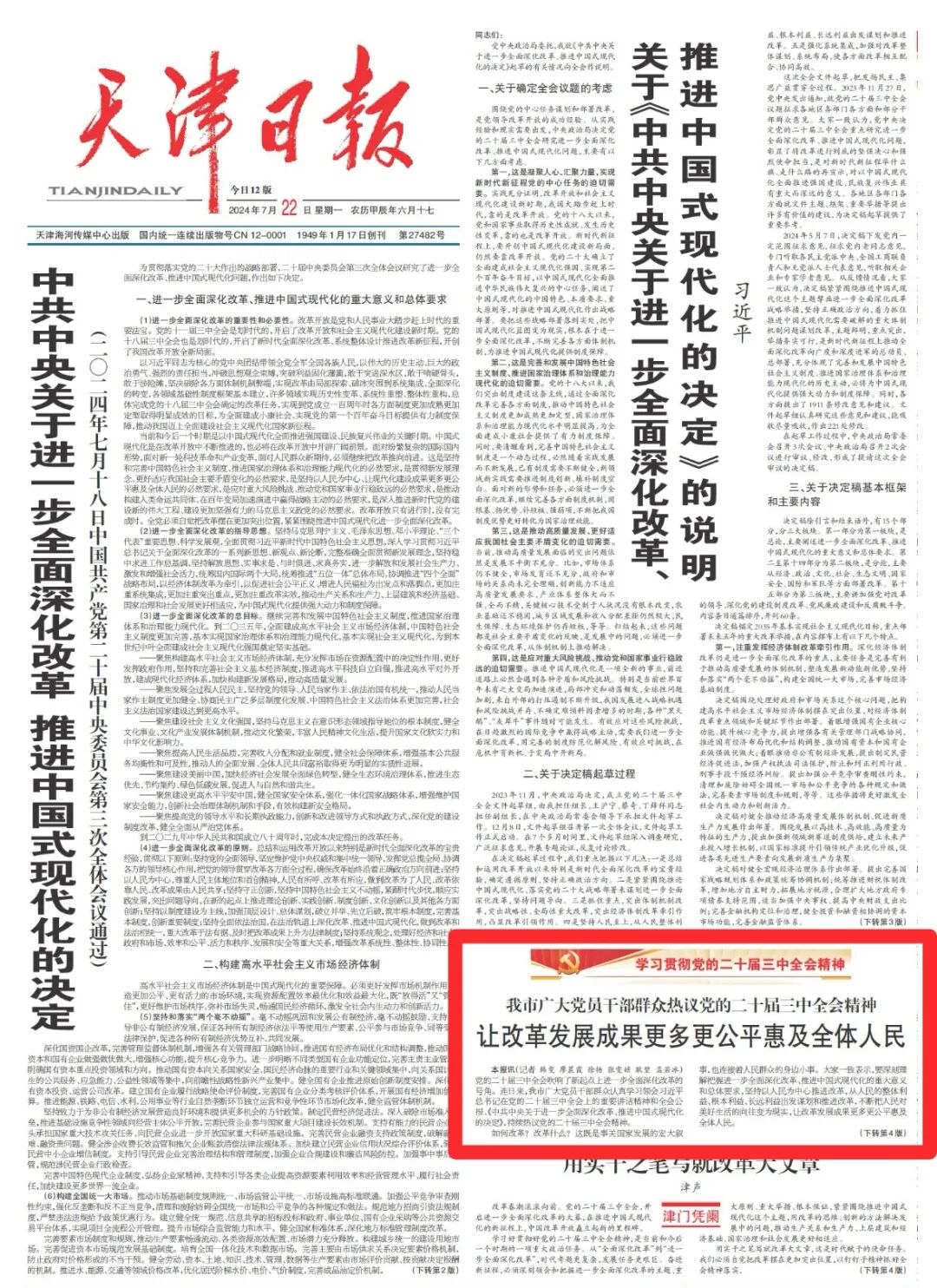 党的二十届三中全会吹响了新起点上进一步全面深化改革的号角。连日来,我市广大党员干部群众认真学习领会习近平总书记在党的二十届三中全会上的重要讲话精神和全会公报、《中共中央关于进一步全面深化改革、推进中国式现代化的决定》,持续热议党的二十届三中全会精神。