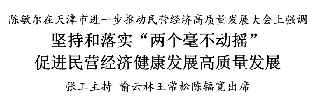 陈敏尔在讲话中指出,党的十八大以来,习近平总书记站在党和国家事业发展全局的高度,就促进民营经济发展多次发表重要讲话、作出一系列重要指示,在今年民营企业座谈会上充分肯定了民营经济发展取得的重大成就和作出的重要贡献,对当前及今后一个时期促进民营经济健康发展、高质量发展作出部署。我们要把习近平总书记在民营企业座谈会上的重要讲话精神与习近平总书记关于民营经济发展的重要论述贯通起来,与习近平总书记视察天津重要讲话精神结合起来,一体学习贯彻,深刻领会把握党和国家对民营经济发展的基本方针政策,深刻领会把握民营经济发展面临的机遇和挑战,深刻领会把握促进民营经济发展的重点任务,切实增强责任感使命感紧迫感,进一步完善落实“两个毫不动摇”的体制机制,推动民营经济工作取得更大进展。