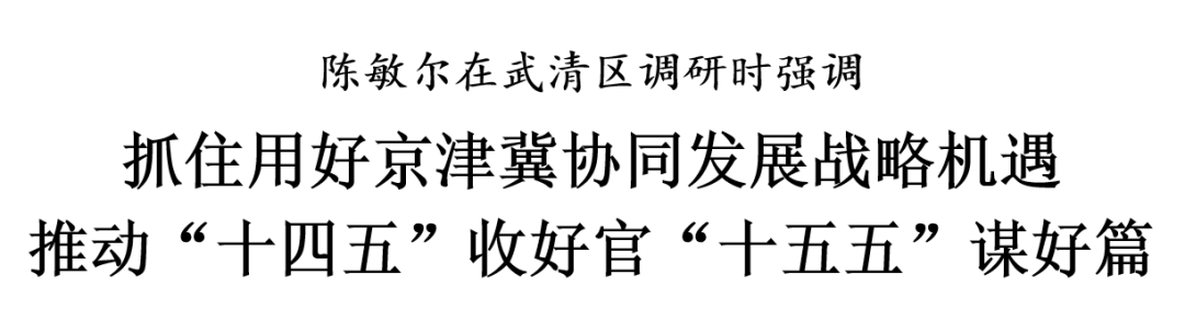 在武清京津产业新城投资促进会客厅,陈敏尔听取武清区做好当前经济工作和推进武清京津产业新城高质量发展等情况汇报。他说,武清区在落实京津冀协同发展战略中发挥着重要作用,面临着重要机遇,推动高质量发展方兴未艾、正逢其时。要深学深用习近平总书记视察天津重要讲话精神,以推进京津冀协同发展为战略牵引,找准方位定位,把握工作落点,唱好京津“双城记”,建强武清京津产业新城等平台载体,做好站产城融合、商文旅融合文章,推动教育科技人才一体化发展。要注重规划引领,统筹当前和长远,进一步完善空间、交通、产业规划,增强规划的科学性、战略性、可操作性,更好从全局谋划一域、以一域服务全局。要强化政策支撑,用足用好中央存量政策和一揽子增量政策,把市委、市政府支持武清京津产业新城高质量发展的政策措施落实落细落到位,充分释放政策的综合效应、叠加效应。要加强产业导入,突出产业链招商、以商招商,深化拓展与国企、民企、外企合作,引入更多有科技含量、就业容量、环境质量、税源增量的项目,加快形成新质生产力。要完善城区配套,优化生产、生活、生态空间布局,注重职住平衡,提升公共服务水平,推动交通便利化,营造近悦远来的良好环境。要坚持安全托底,更好统筹发展和安全,有效防范化解各类风险,深入排查化解矛盾纠纷,切实维护社会安全稳定,筑牢首都政治、安全“护城河”。