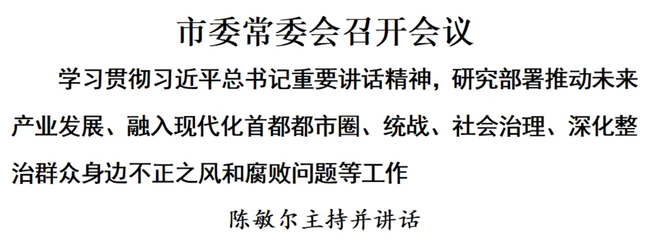 2月5日,市委常委会召开会议,学习贯彻习近平总书记在中央政治局第二十四次集体学习时的重要讲话精神,学习贯彻《中共中央、国务院关于〈现代化首都都市圈空间协同规划(2023—2035年)〉的批复》精神,研究部署有关工作。市委书记陈敏尔主持会议并讲话。