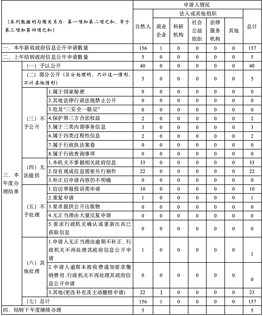 2025年度,我委共收到依申请公开政府信息共计157件,其中,申请人为法人或其他组织1件,公民156件,全部按照规定时限予以答复,未收取任何费用。其中通过政府信息公开网申请143件,信函申请14件。属于主动公开2件,予以公开38件,部分公开5件,不予公开7件,不属于本机关公开33件,所申请信息不存在11件,撤销申请23件,不予处理30件,申请内容有误3件,结转至下一年度办理5件。