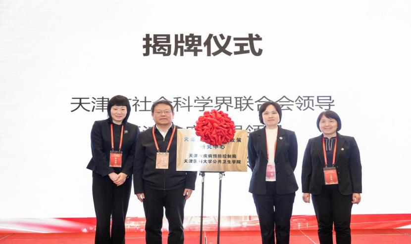 张再生、韩金艳、舒珺与天津医科大学公共卫生学院党委书记王铁英共同为“研究中心”揭牌。