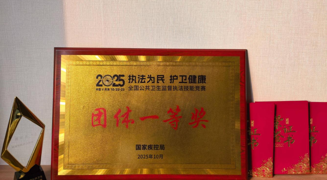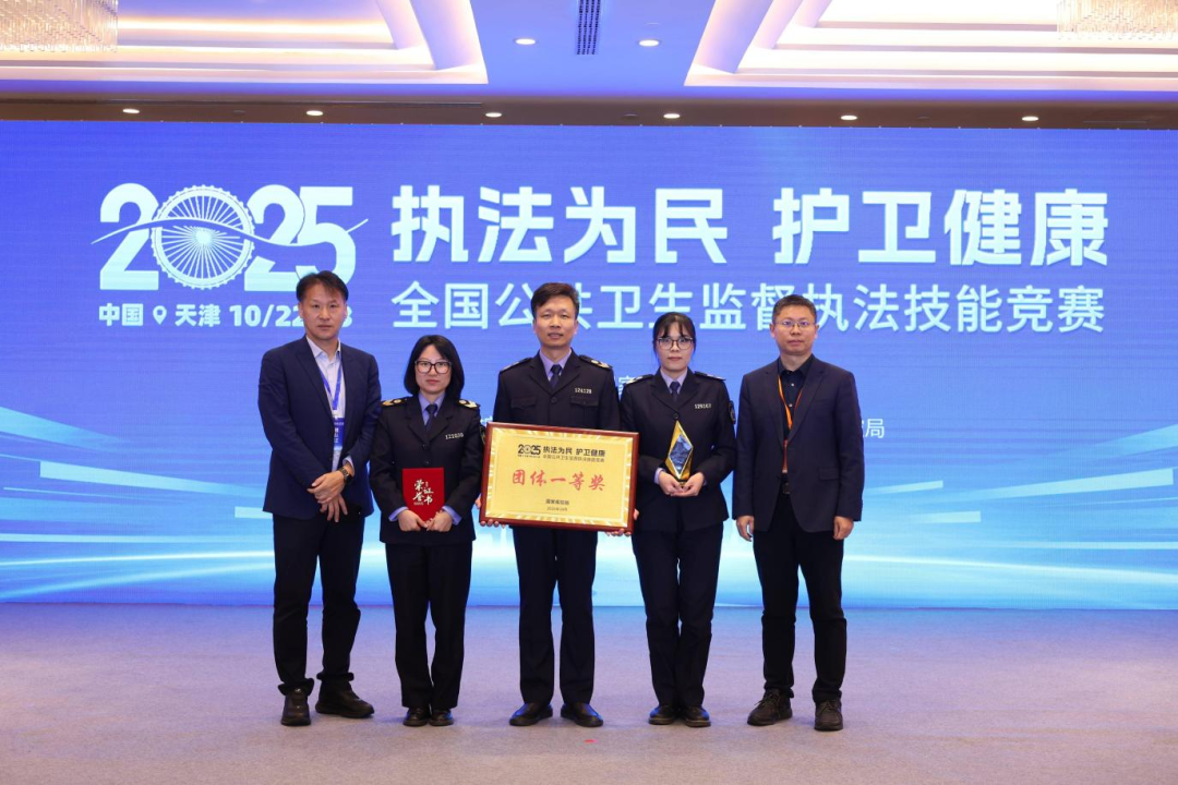 在10月21日至23日国家疾病预防控制局主办的2025年全国公共卫生监督执法技能竞赛中,天津市代表队表现优异、成绩突出!3名参赛队员齐心协力,通过与全国32支省级代表队96名公共卫生监督执法能手激烈角逐,一举斩获团体赛一等奖,个人赛公共场所专业一等奖、学校与生活饮用水专业、职业与放射卫生专业两个三等奖,实现满堂红!