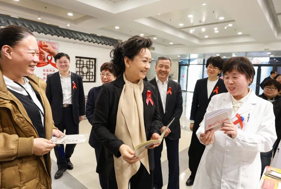 主题宣传活动开始前,彭丽媛等参加社区防艾宣传活动,了解艾滋病及相关疾病科普、健康咨询、志愿者服务等工作开展情况,亲切慰问社区一线防艾工作人员和志愿者。